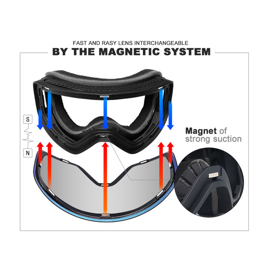 These ski goggles feature a frameless design with a magnetic lens system for quick and easy lens removal and replacement, offering versatile light adaptation. The lenses incorporate polarized light functionality and an anti-fog coating to ensure clear vision during skiing while effectively reducing glare. The full-rim frame design enhances structural stability while maintaining a lightweight feel. The goggles come with an adjustable elastic strap, suitable for both men and women, accommodating various head shapes and ski helmets. Their versatile application makes them ideal not only for skiing but also for snowboarding and other outdoor activities.